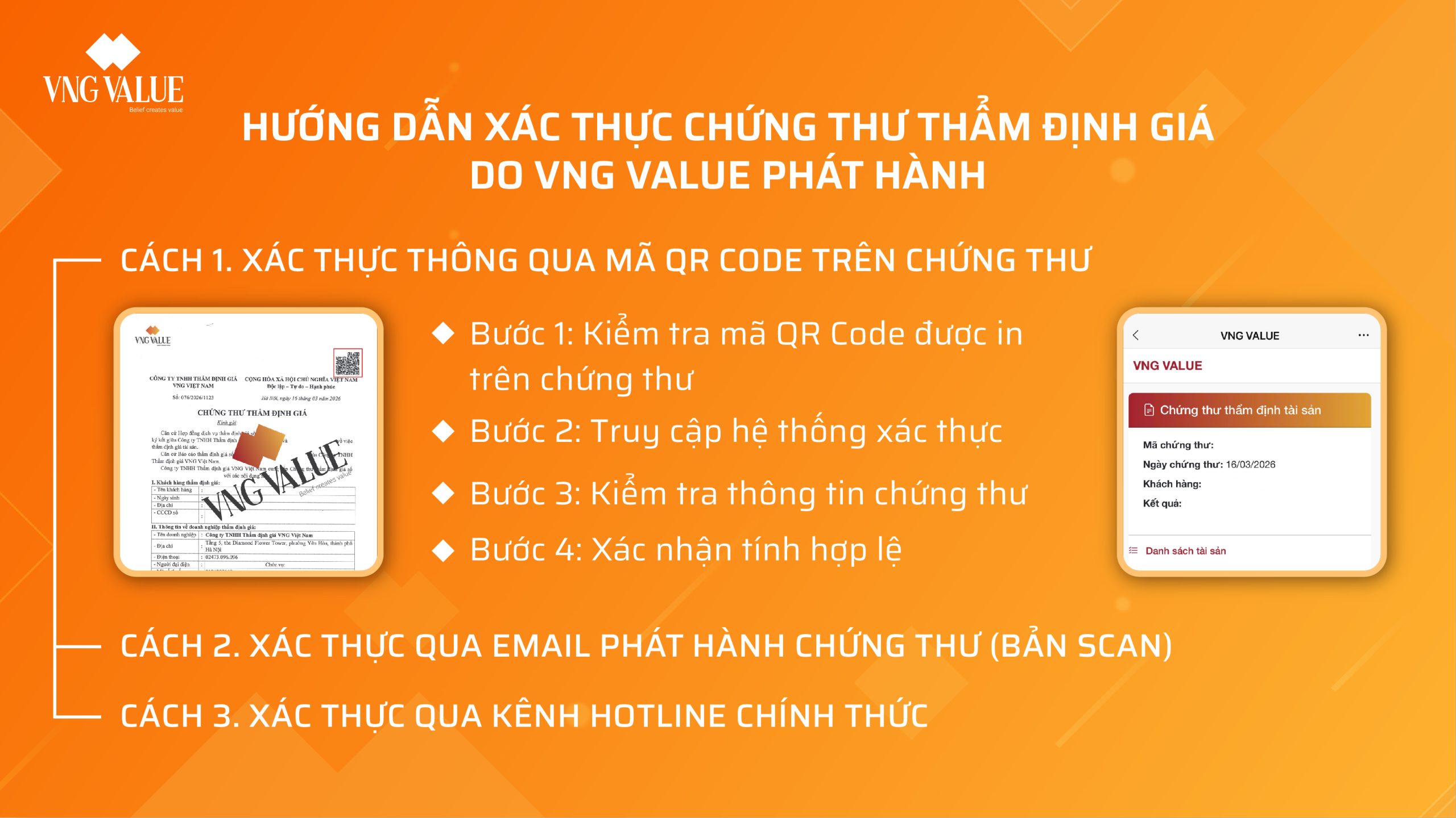 Nhằm hướng đến xây dựng mối liên kết hợp tác bền vững lâu dài và định hướng cho thời gian sắp tới, đồng thời đảm bảo tính chuyên nghiệp trong hoạt động thẩm định, Công ty TNHH Thẩm định giá VNG Việt Nam (VNG Value) cam kết đảm bảo chất lượng dịch vụ, đạo đức hành nghề và bảo mật thông tin.