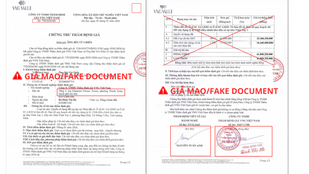 VNG Value chỉ chịu trách nhiệm đối với các chứng thư thẩm định giá được phát hành hợp pháp theo quy trình kiểm soát nội bộ của doanh nghiệp.